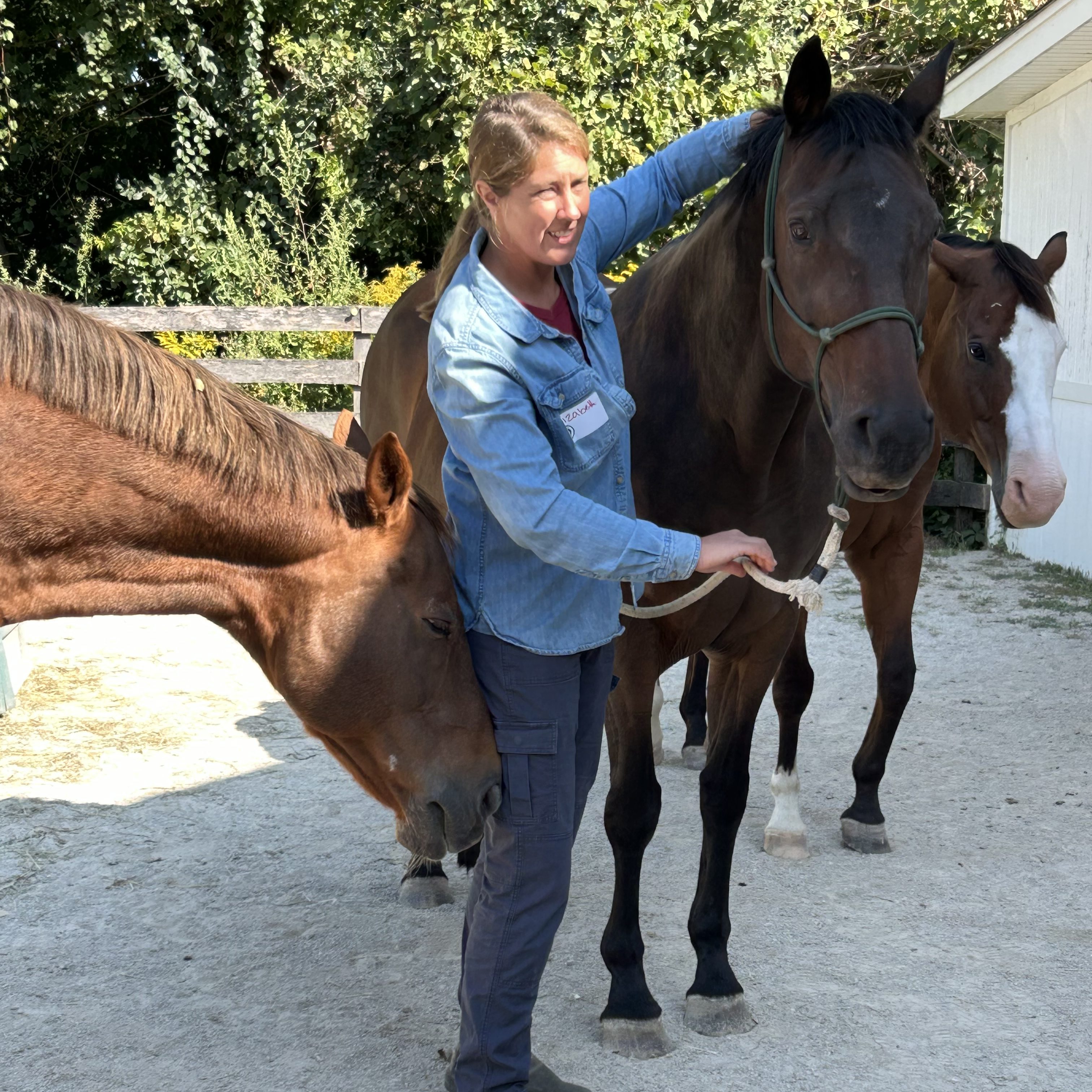 Elizabeth’s life with horses began as a youngster involved in the United States Pony Club. She has always been equally fulfilled riding, grooming or companioning with her horse herd. Elizabeth developed herself through yoga, chiropractic work to heal an injury, mindfulness training, and meditation. This led to an awareness of how interwoven her physical experiences and her emotional and stress responses are to one another. With time, she saw echoes of the same connections of body, mind, and spirit emerging within the horses around her.
